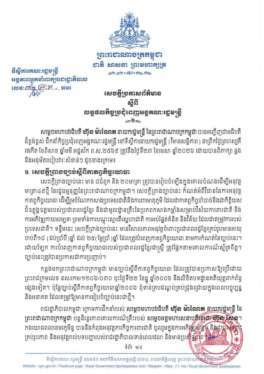 东盟头条金边4月24日电 柬埔寨首相洪玛奈4月23日主持内阁全体会议,对五项重要议程进行审议并作出决定,其中《兵役法》草案引发广泛关注。该法案已获会议通过,草案规定18岁至25岁的公民须依法履行兵役义务,女性则按照自愿原则参与。